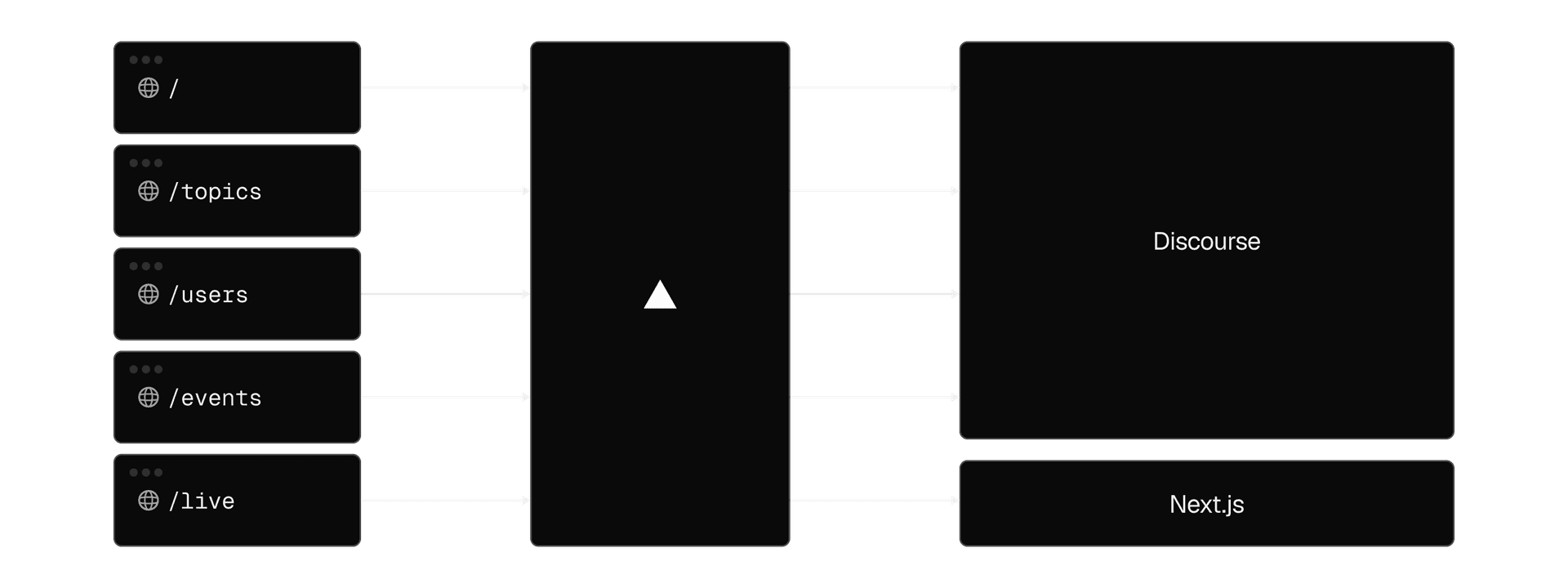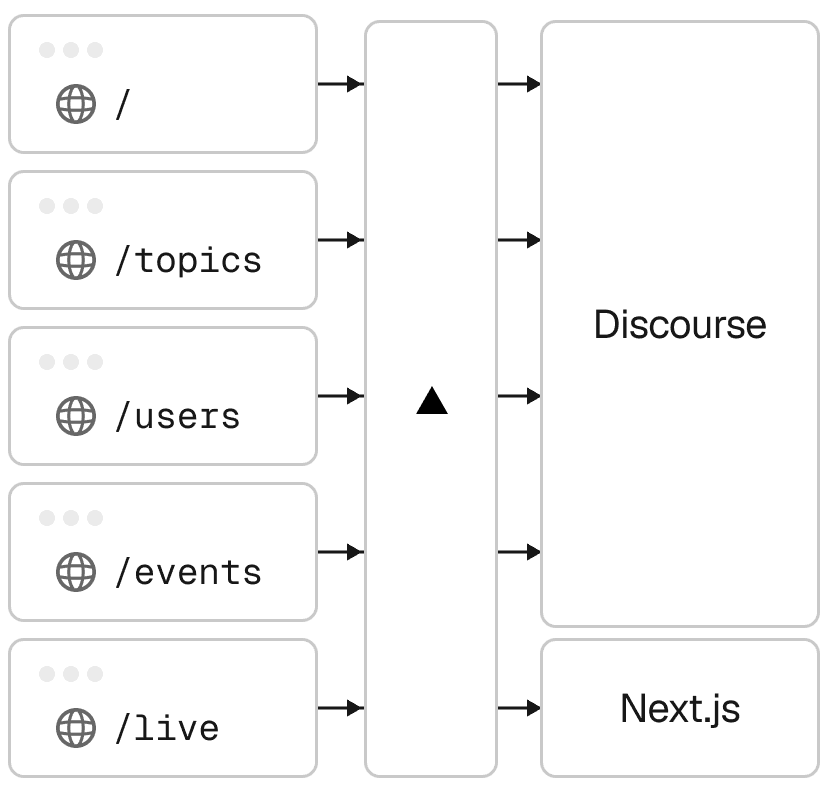 Some parts of the community platform, like Vercel Community live sessions, run directly on Vercel with Next.js. We use Vercel Microfrontends to mount a Next.js app on the same domain as the Discourse app, for three reasons:
