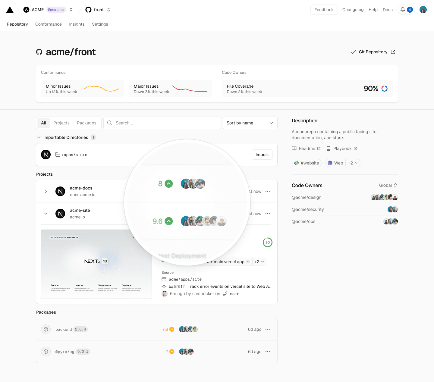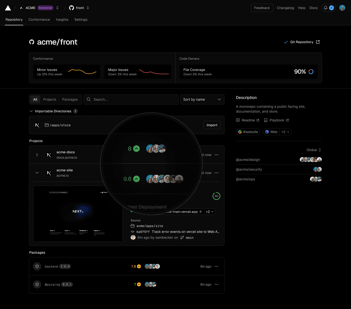 When you start using Conformance, you'll also see a redesigned dashboard within vercel.com that gives developers and leadership team members an overall view of project health. At a glance, any team member can see global code health, Conformance scores, and the teams responsible for those repositories. This means, you can understand problem areas and investigate errors by seeing all of your allowlisted performance, security, or code-quality errors.
