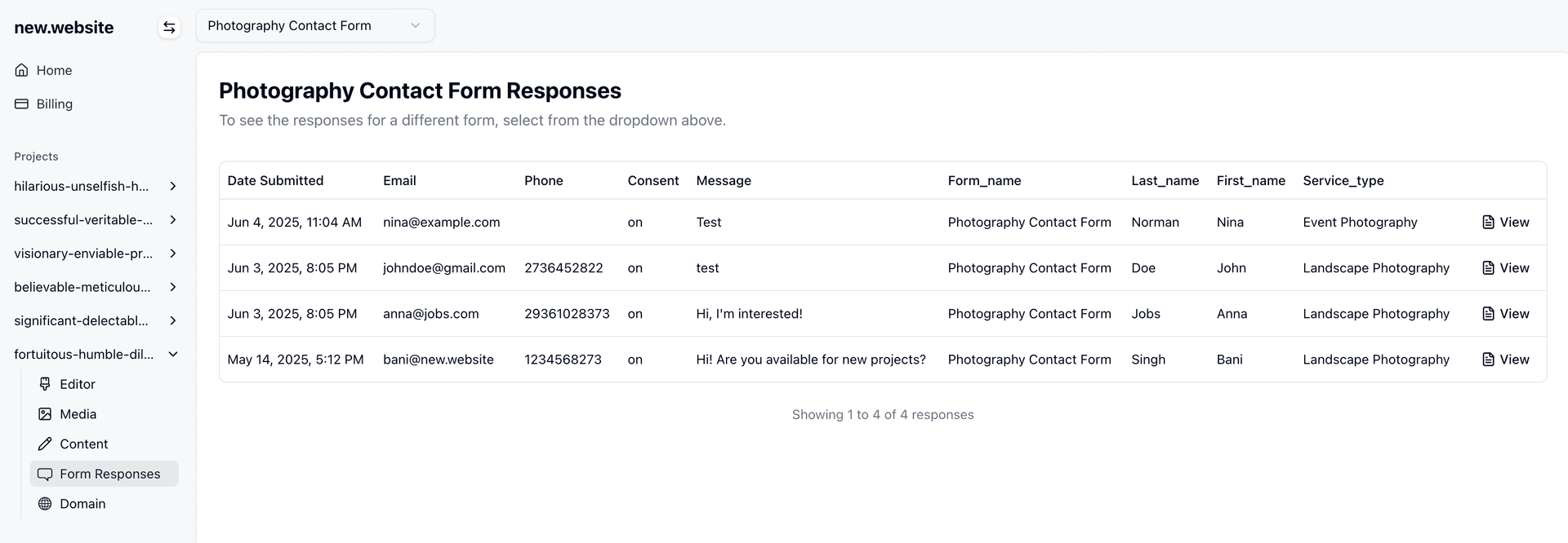• Built-in forms and databases. Every site came with forms by default and every submission was automatically stored without any setup.
