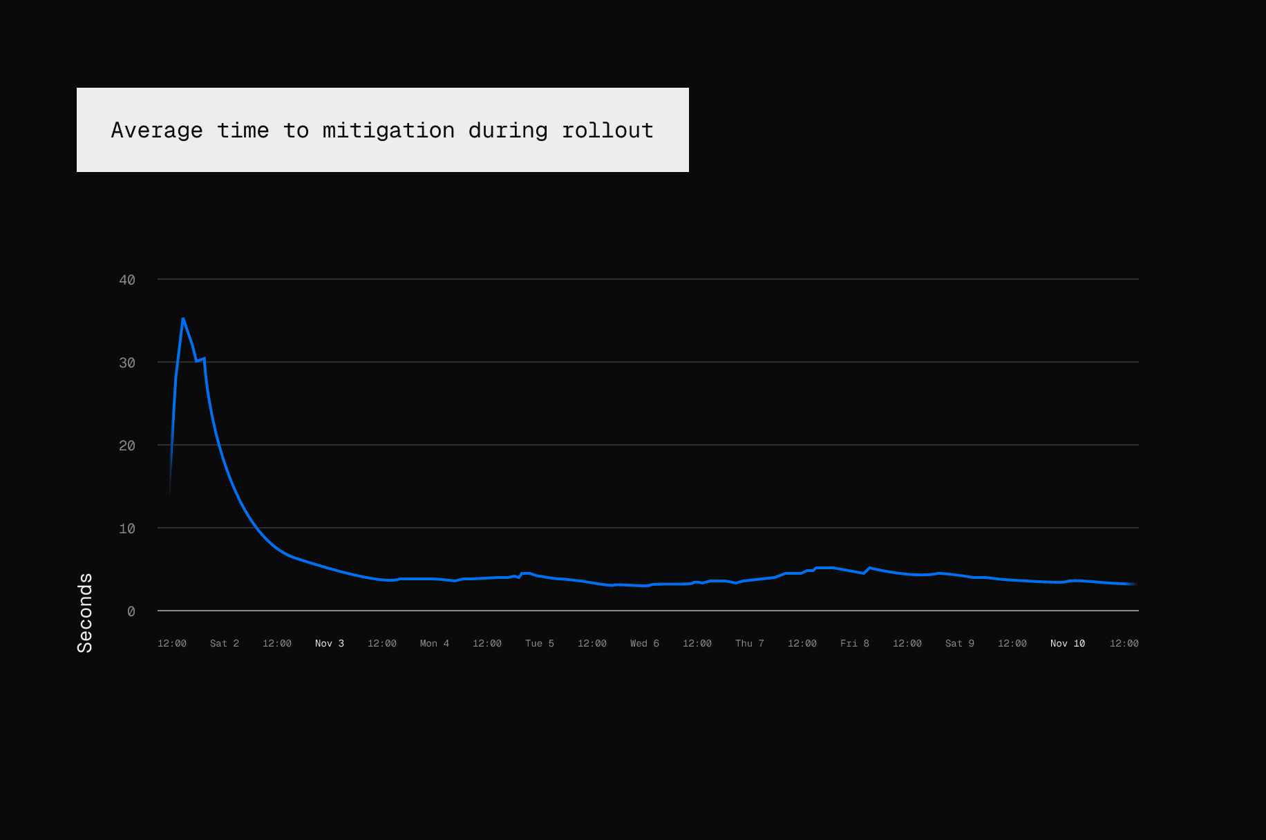 Since fully rolling out Protectd in January 2025, a process that began in November, every Vercel user now benefits from a significantly faster, more adaptive security infrastructure. The system consistently delivers a P99 time to mitigation of 3.5 seconds, a P50 of 2.5 seconds, and can respond to threats in as little as 0.5 seconds.