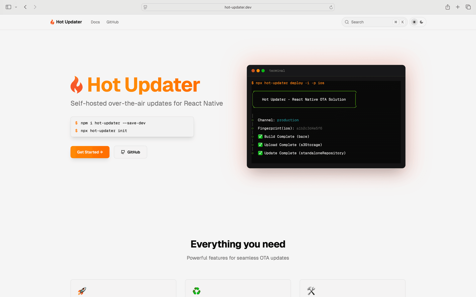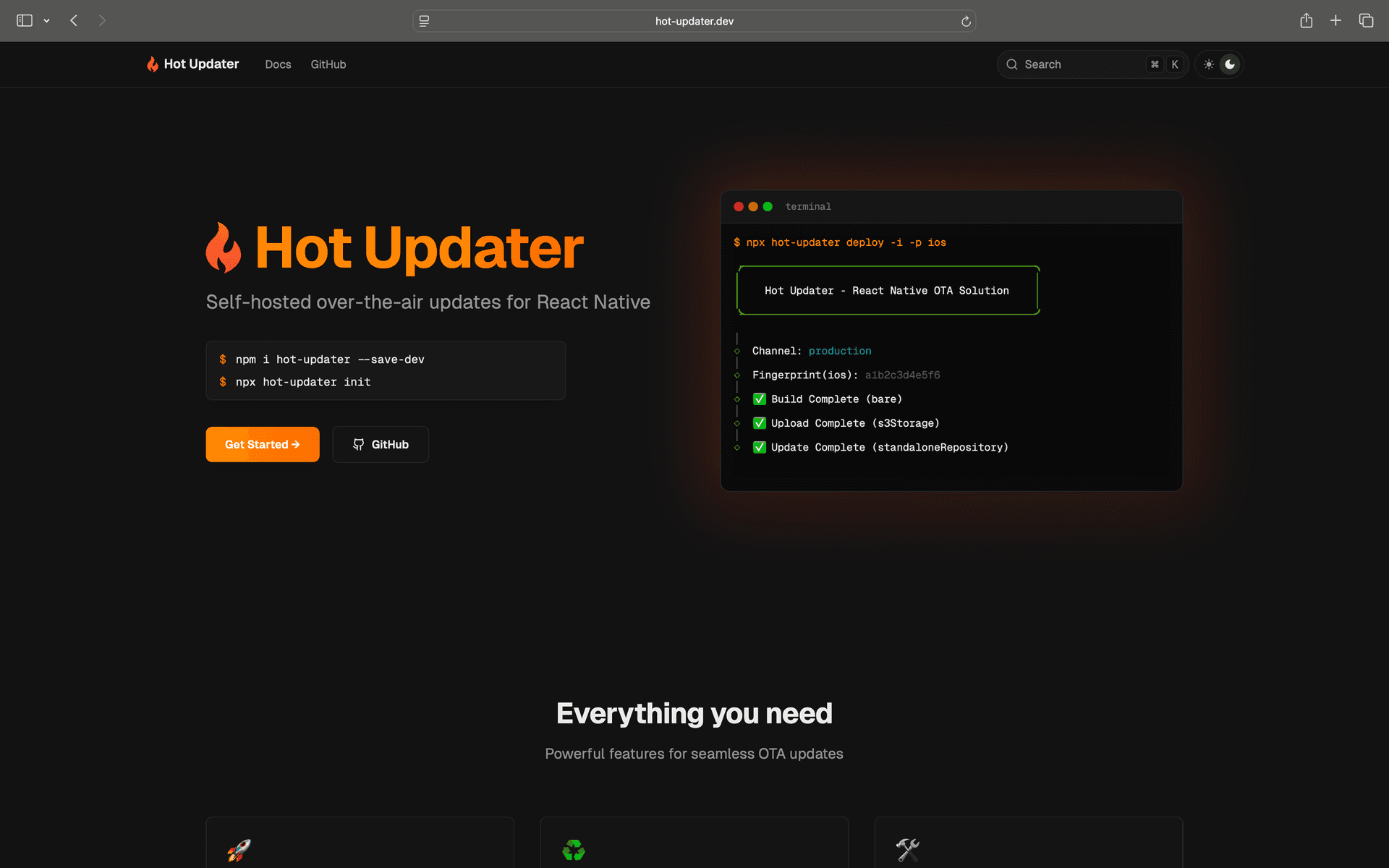 An open source React Native OTA (Over-The-Air) update solution built as a modern alternative to CodePush, designed to avoid vendor lock-in and work across many infrastructure providers.