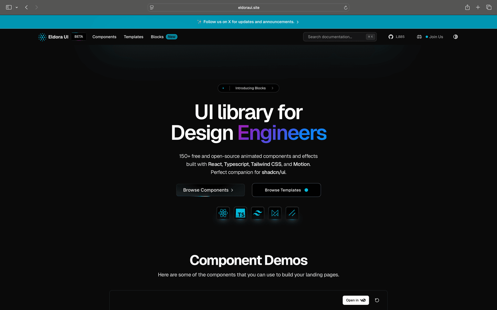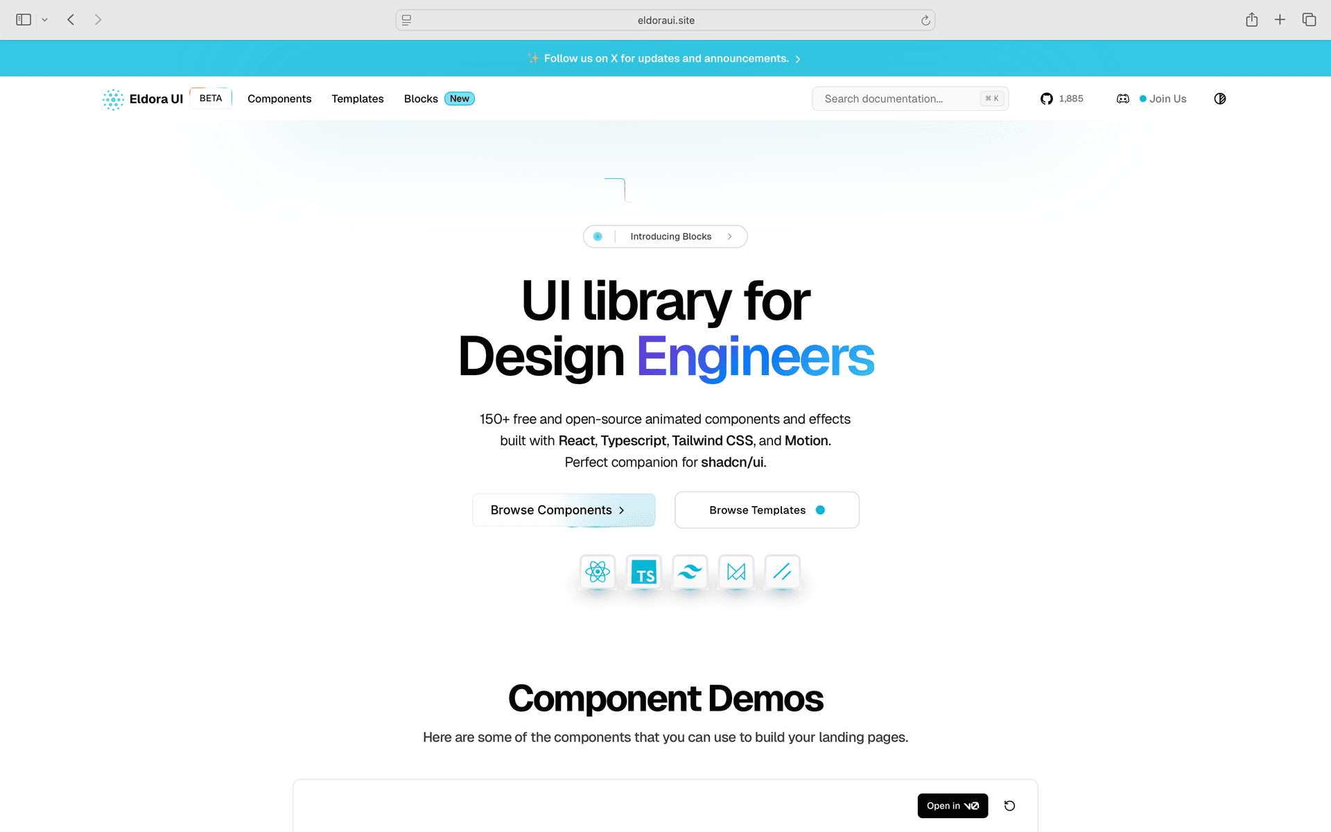 An open source component library with production-ready React components and UI blocks featuring smooth, performance-focused animations and strong accessibility defaults.