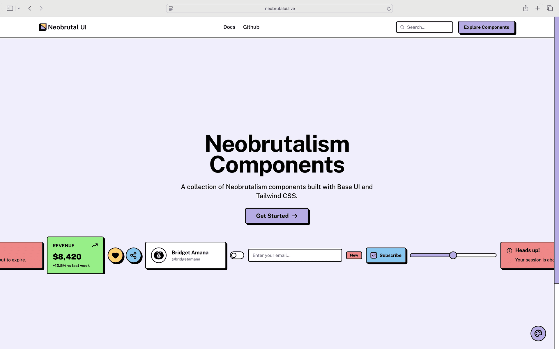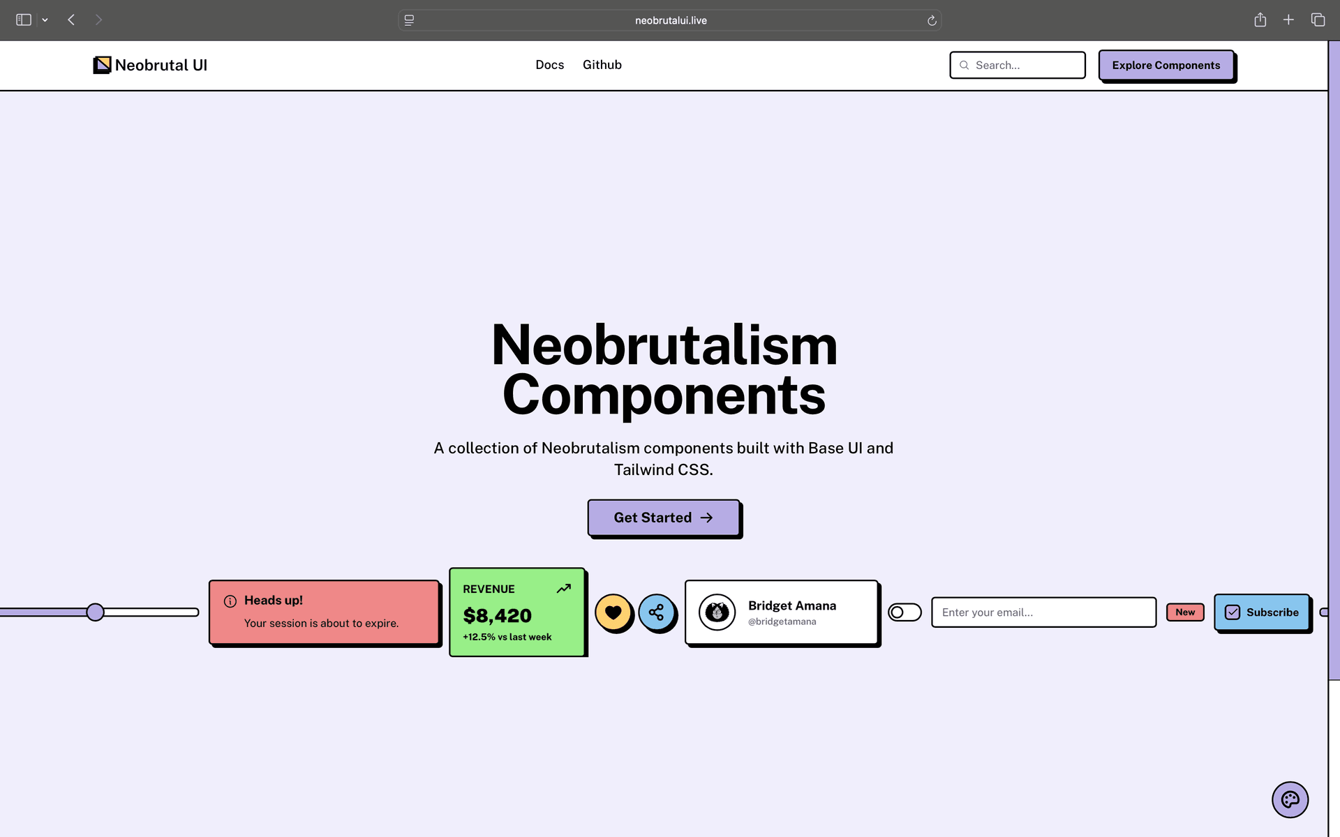 A neobrutalist UI component library focused on bold, expressive design—built as an alternative to the minimalism-heavy component library landscape.