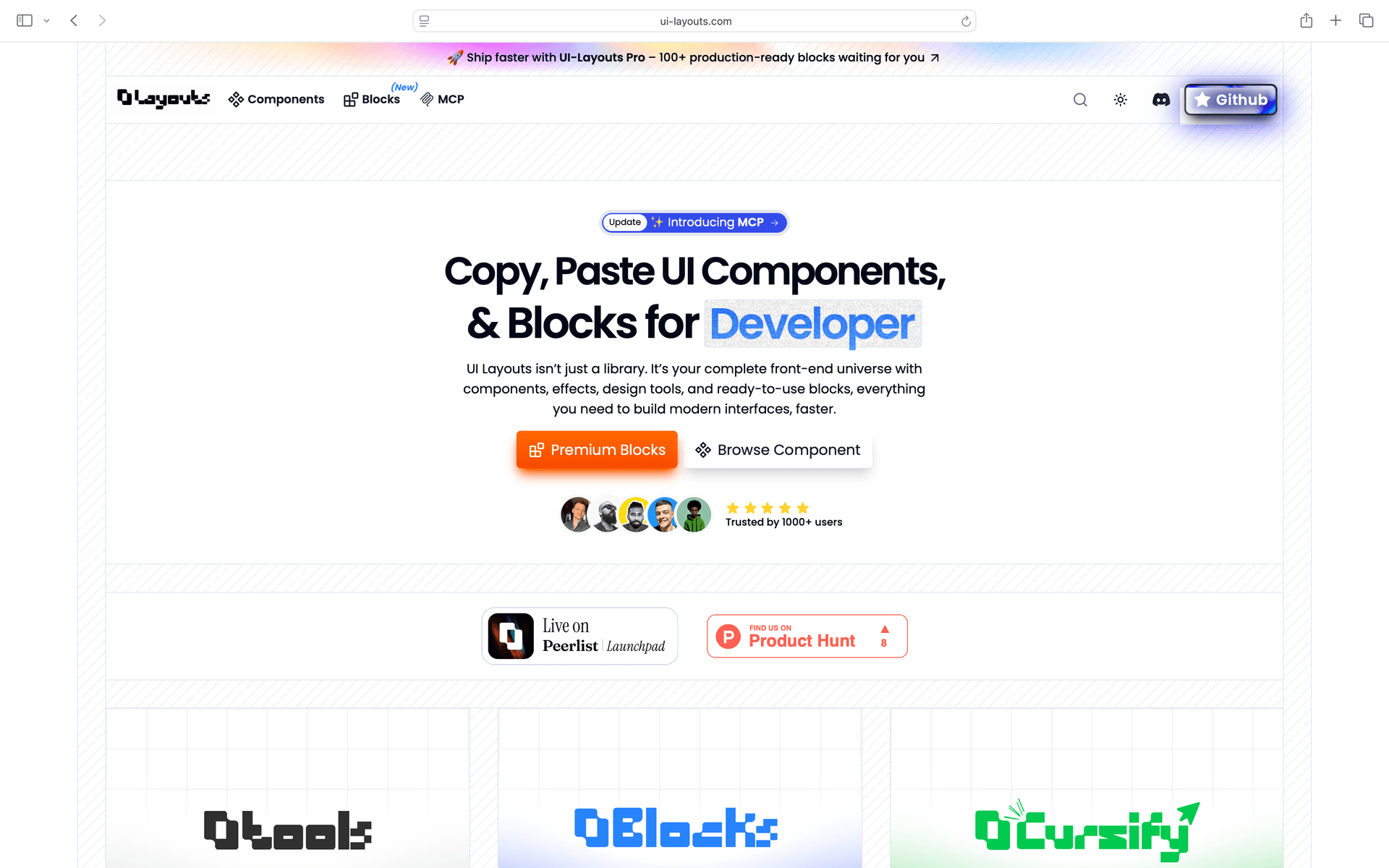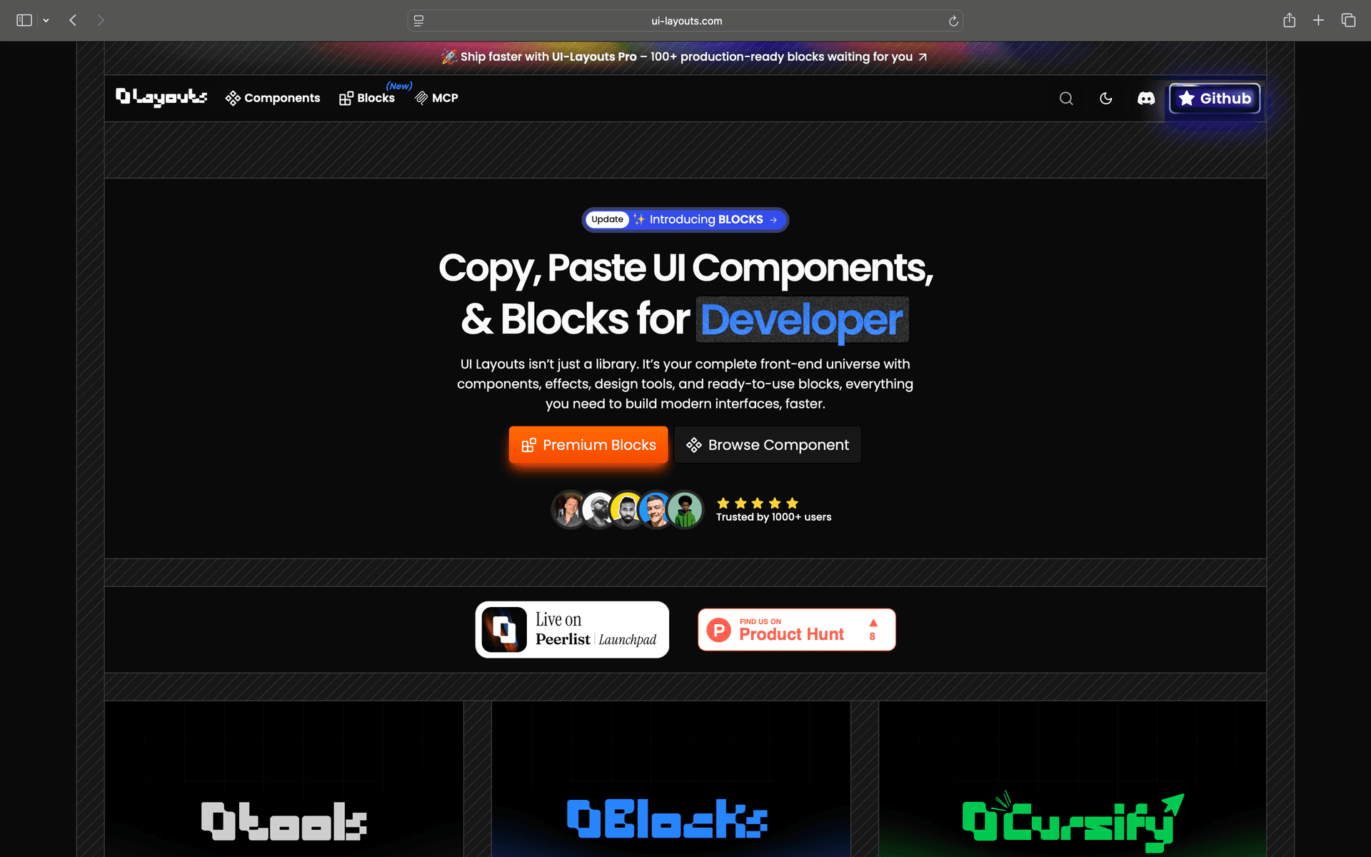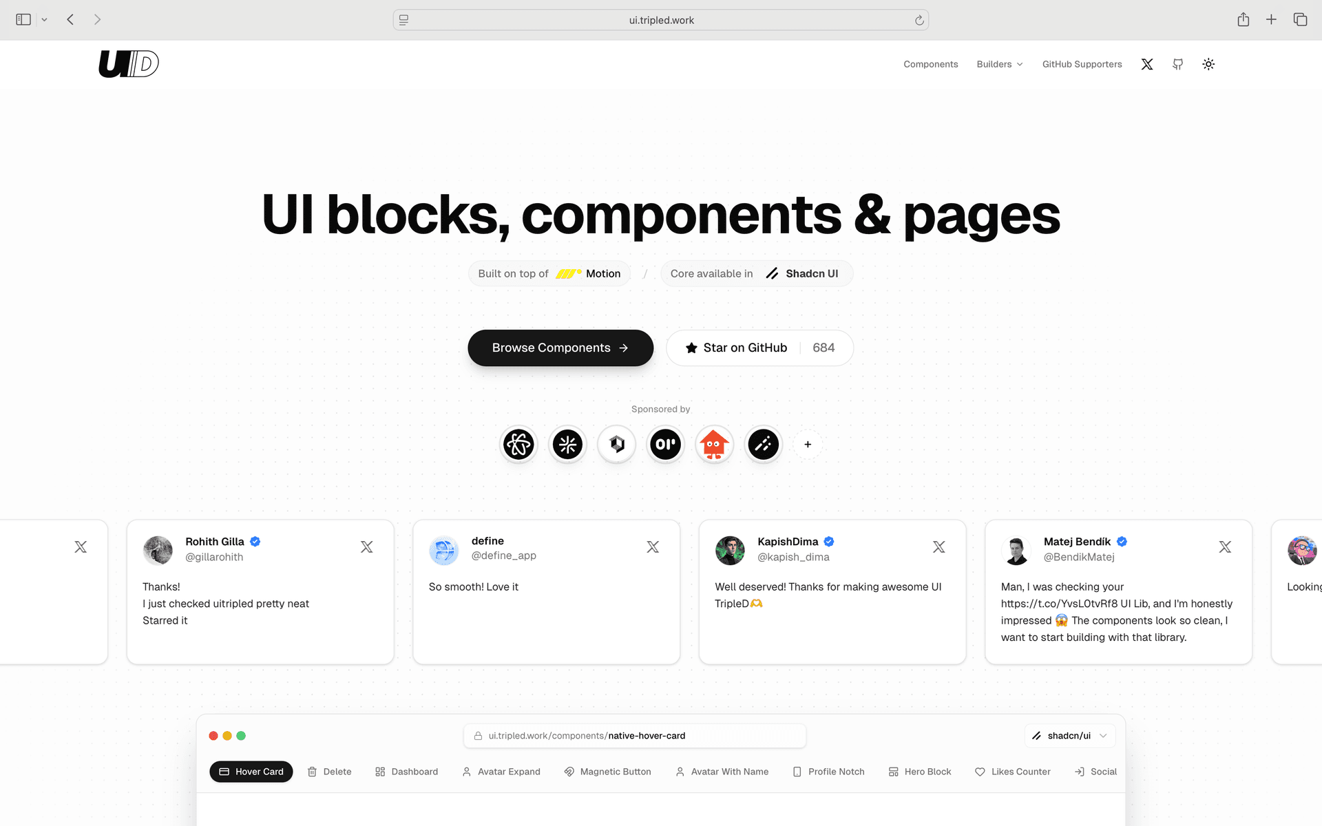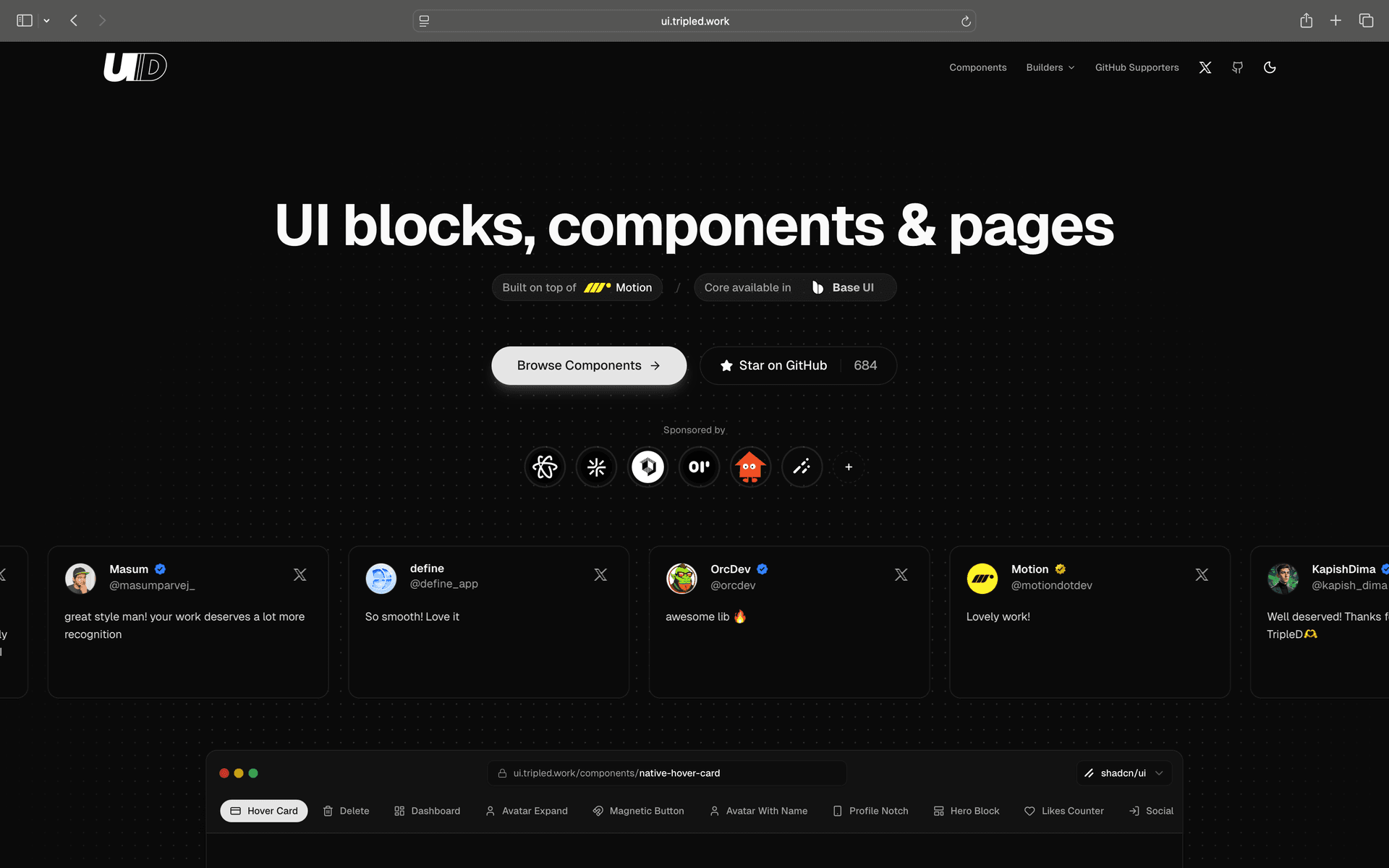 UI TripleD offers UI blocks, components, and full pages in shadcn/ui and Base UI, powered by Framer Motion, with a Landing Builder, Background Builder, and Grid Generator.