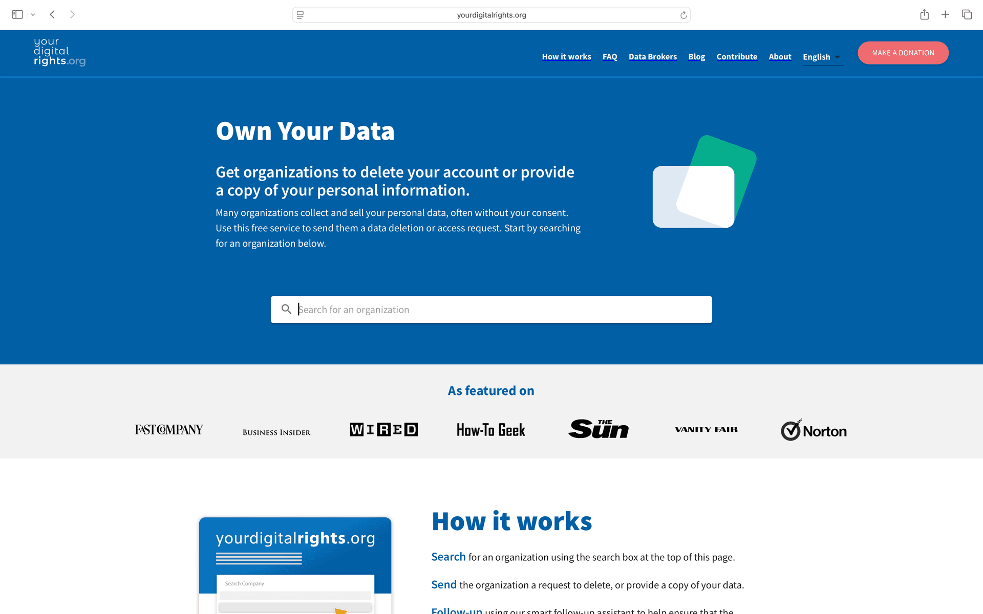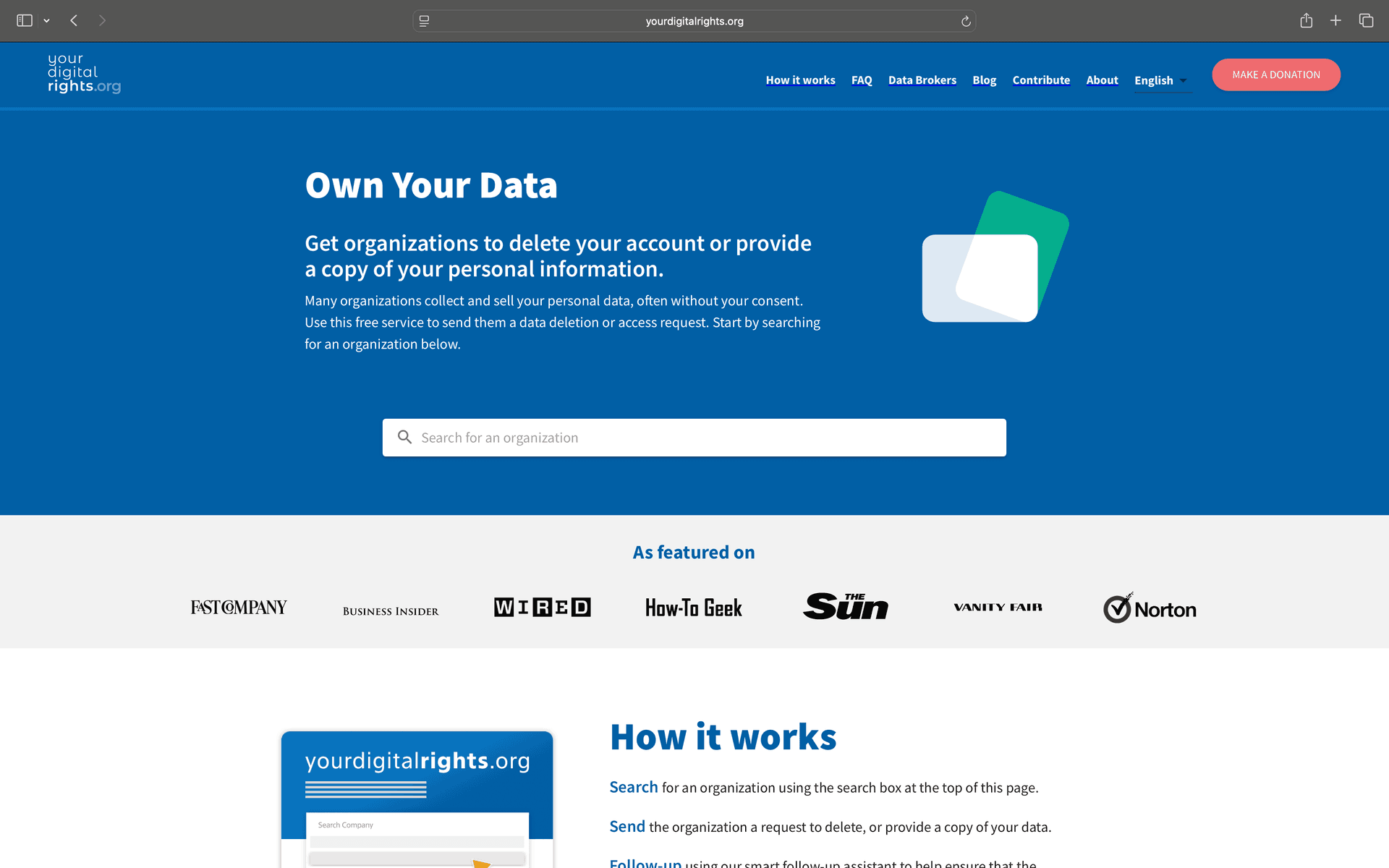 A free, open source platform that helps people regain control of online privacy by automating data deletion requests to organizations and guiding users through resolution.