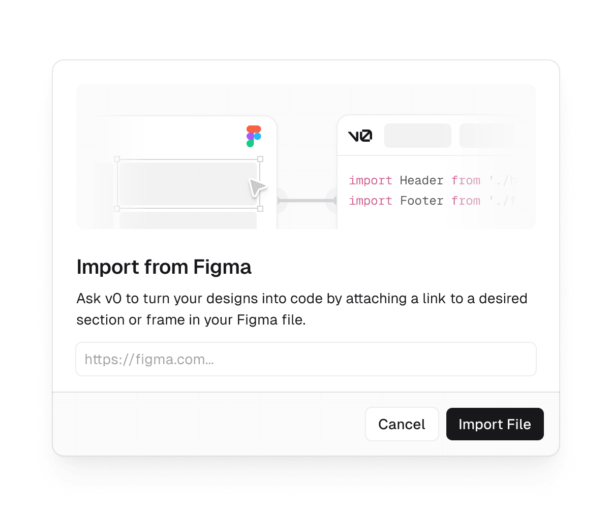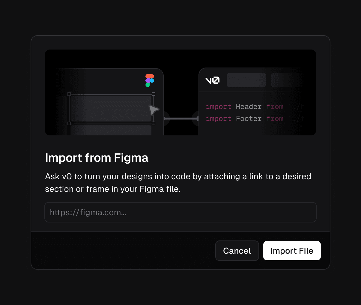 v0’s ability to import existing Figma files allows designers and developers to bridge the gap between design tools and AI-driven development. This feature extracts context from Figma files, along with any supplementary visuals, and passes them into v0's generation process.