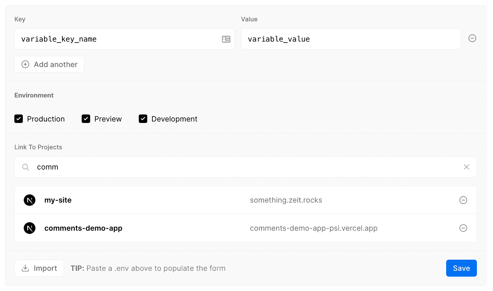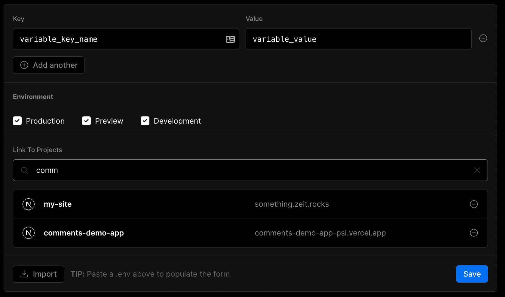 5. From the Environment Variable form, you can link additional projects using the Link to Projects field