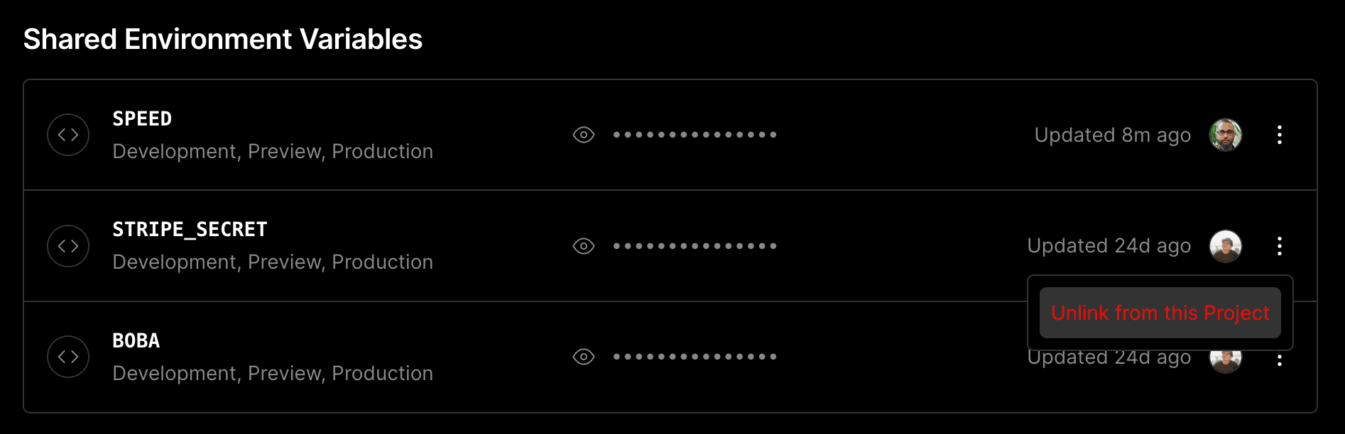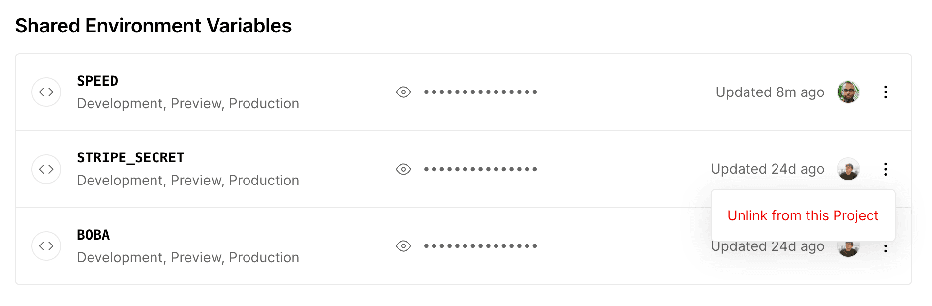 3. Open the context menu for the specific shared environment variable you would like to unlink using the vertical ellipsis icon on the right hand side.