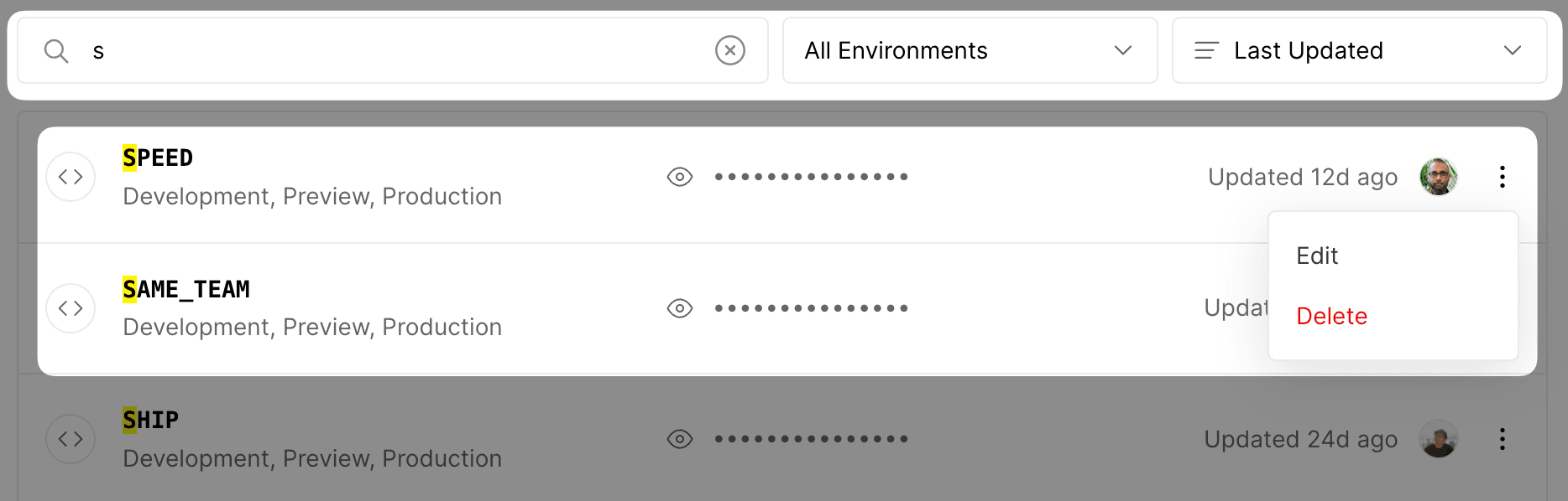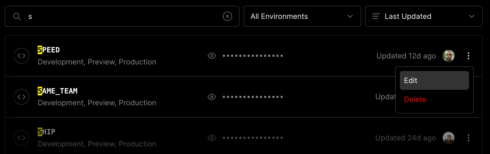3. Use the context menu on the specific Shared Environment Variable by clicking the vertical ellipsis icon on the right side of the row