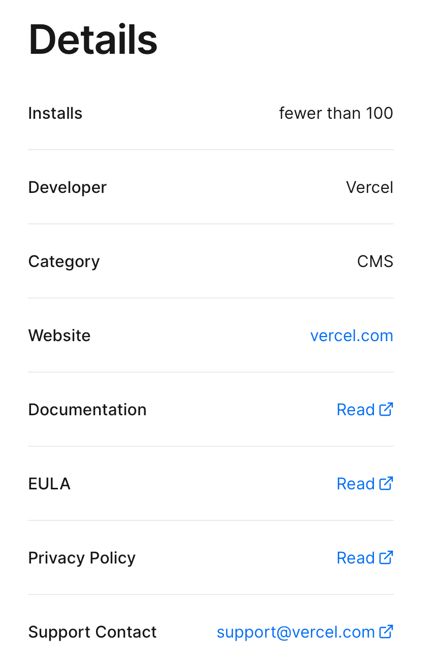 They are displayed in the Details section of the Marketplace integration page that Vercel users view before they install the integration.