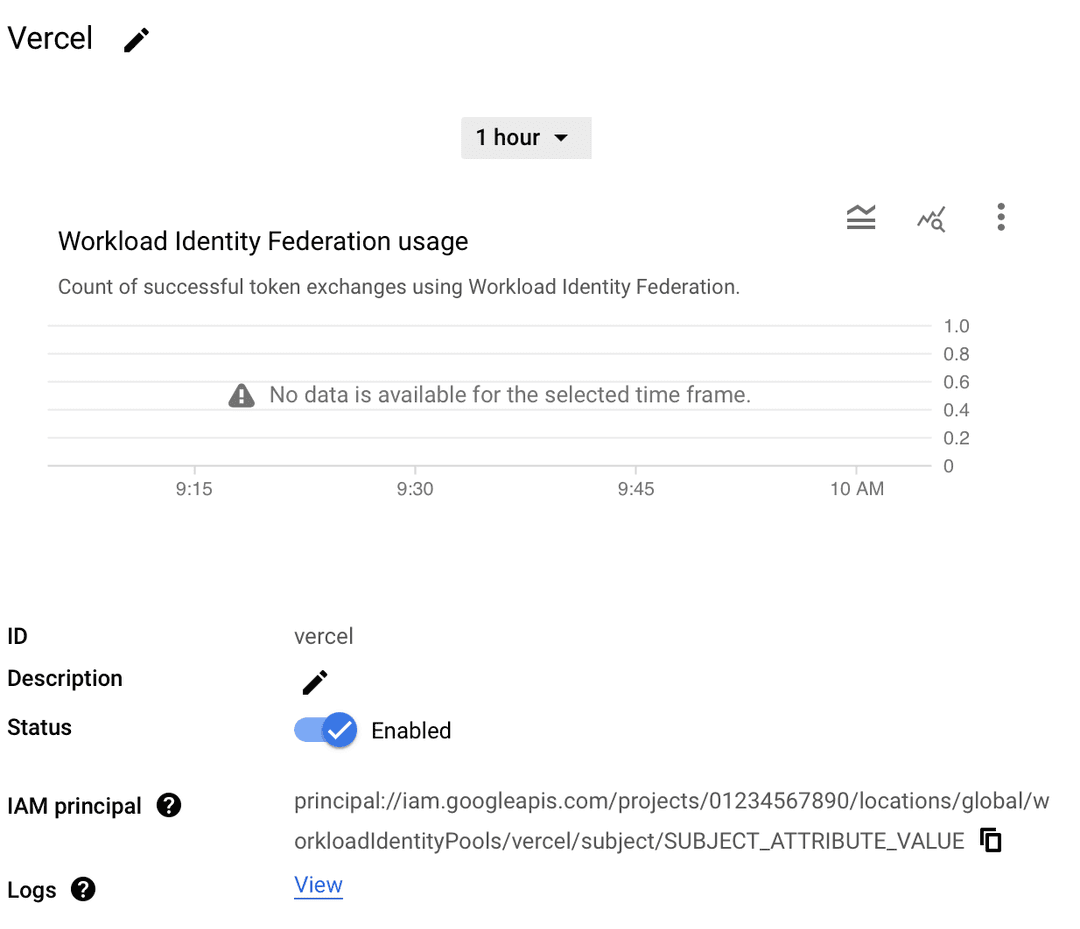 Value Location Environment Variable Example Project ID IAM & Admin -> Settings Project Number IAM & Admin -> Settings Service Account Email IAM & Admin -> Service Accounts Workload Identity Pool ID IAM & Admin -> Workload Identity Federation -> Pools Workload Identity Pool Provider ID IAM & Admin -> Workload Identity Federation -> Pools -> Providers Then, declare them as environment variables in your Vercel project.