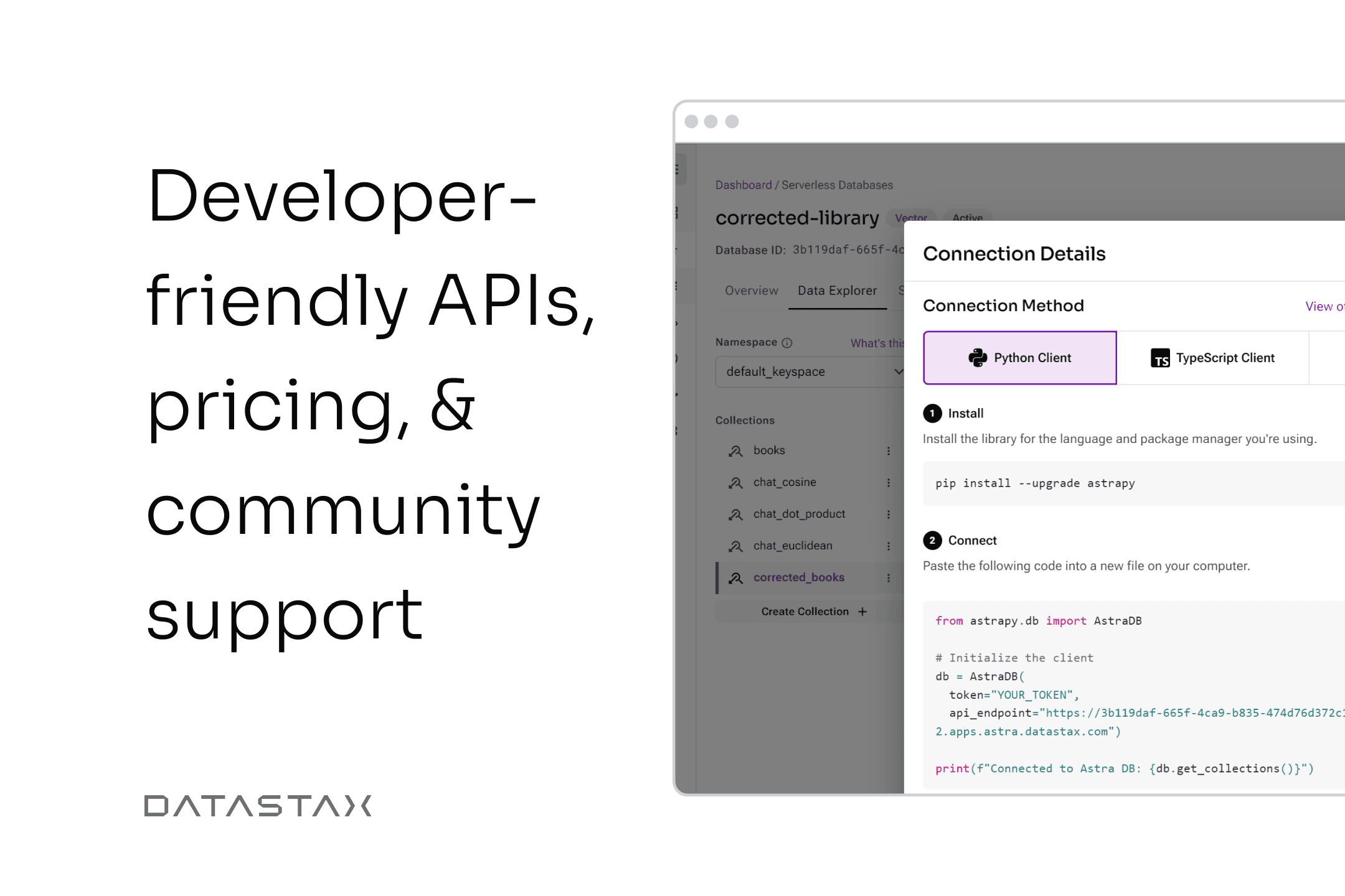 DataStax Astra DB gives you a comprehensive data API for both vector data and other common data types, and the ecosystem integrations for you to build production GenAI applications.