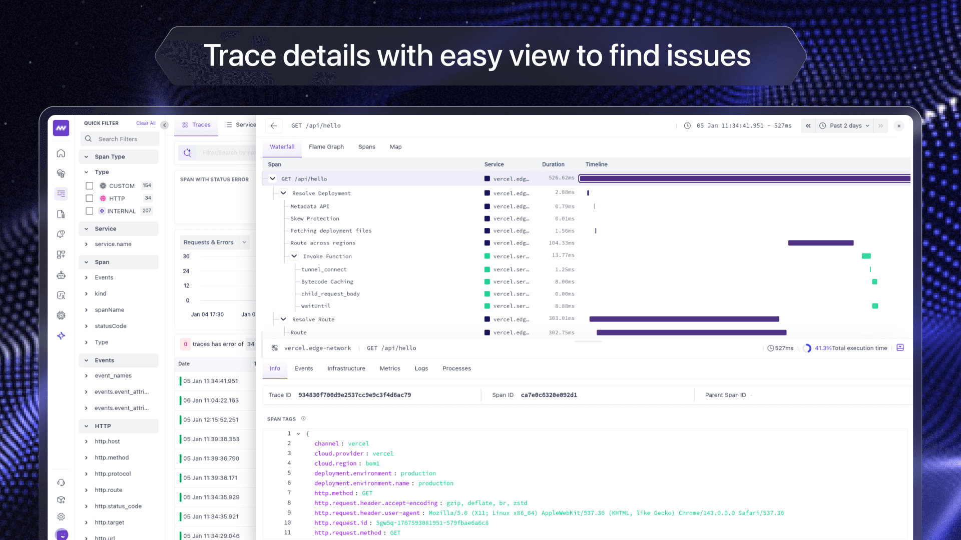 This integration offers a robust APM solution through a unified dashboard with automatic correlation between logs and traces. Monitor all Vercel log sources across production and preview environments, set up alerts, create custom dashboards, and gain insights into performance, latency, and error rates - all without code changes.
