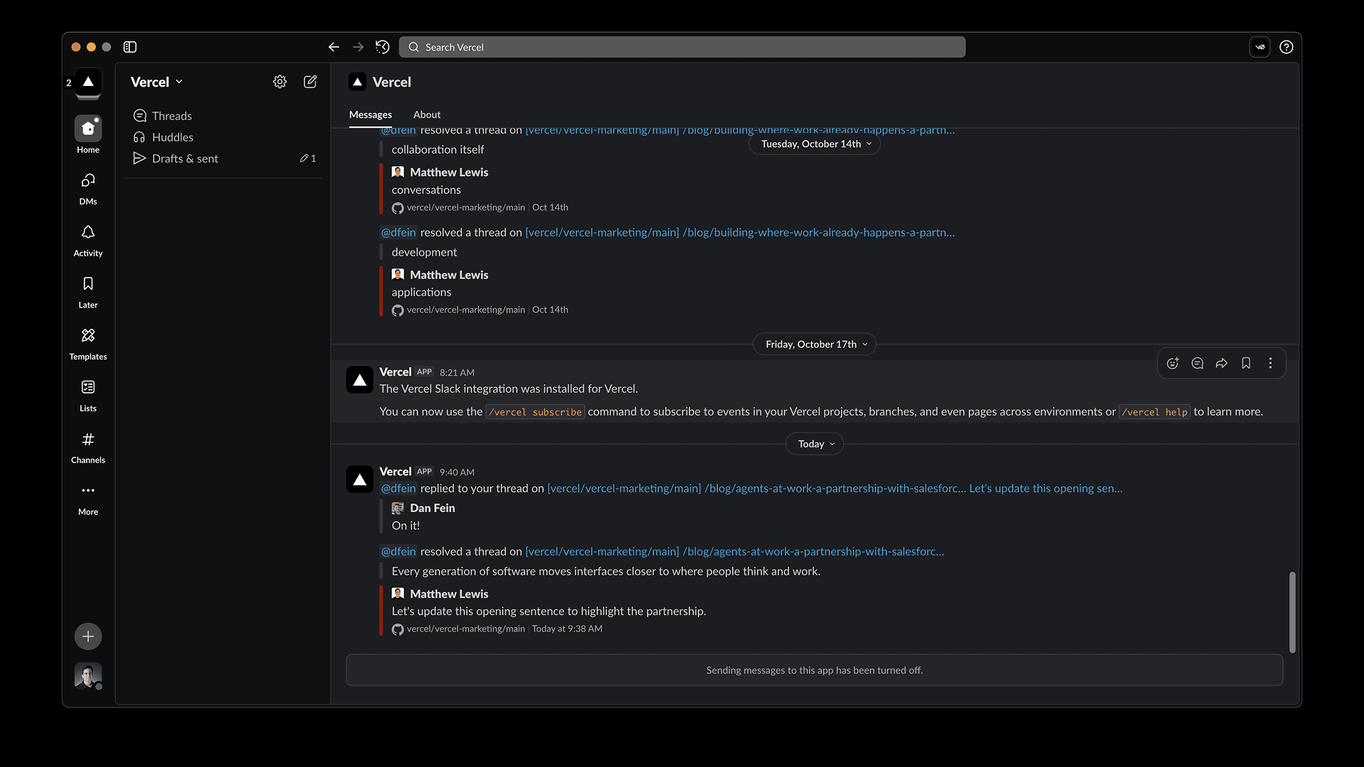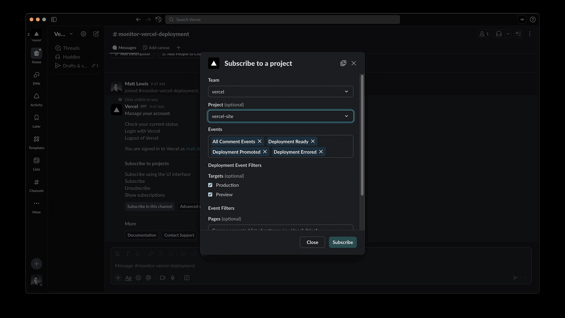 Get Slack messages for comments, deployment status, and new projects on Vercel. This integration allows you to choose Vercel events you’d like to receive Slack messages about and configure these settings for your Slack DMs as well as for specific channels.